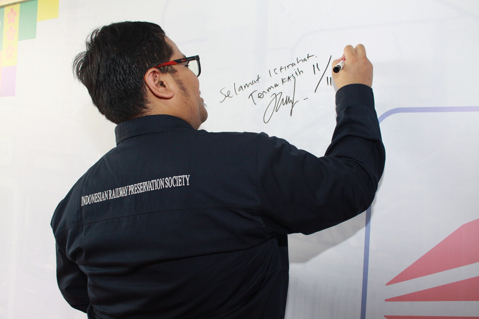 Ketua Umum IRPS Ricki Dwi Agusti menuliskan ucapan terima kasih kepada KRL seri 8500, 7000, dan 203 pada board of memories yang menjadi bagian dari rangkaian acara “Last Run” (Irvan Alaidrus Ilyas/IRPS Jakarta)